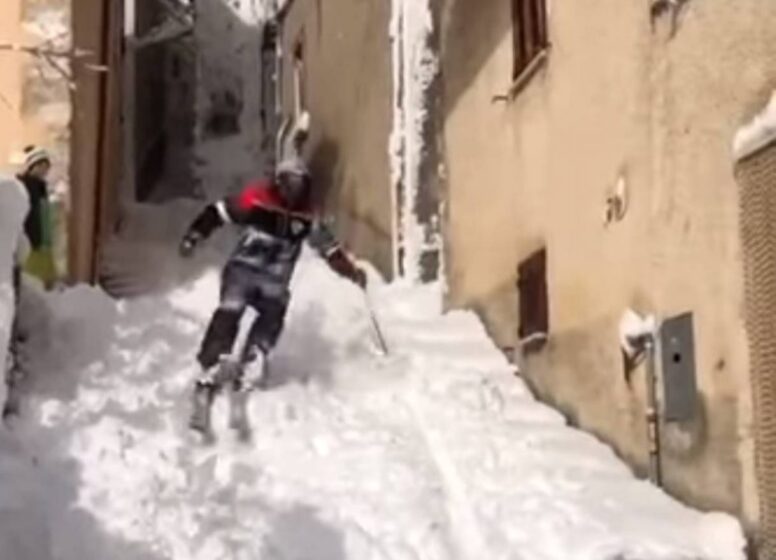 A Rocca di Cambio, con i suoi 1.434 metri di quota il Comune più alto dell’Appennino, si scia tra i vicoli del borgo. Iniziativa, in sicurezza, dei maestri del locale sci club.