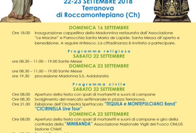 Il sindaco Adamo Carulli annuncia che “La due giorni, 22 e 23 settembre, si svolgerà in contrada Terranova per celebrare San Gennaro e la Madonna Addolorata. Già la settimana scorsa l’associazione “Le Macine” insieme alla Parrocchia ed al Comitato feste hanno inaugurato la cappellina della Madonnina di Terranova, recentemente restaurata, con una messa all’aperto e con la benedizione a cui hanno partecipato anche tutte le autorità locali. Il programma dei festeggiamenti prevede, a partire da domani mattina, 22 settembre, lo svolgimento del mercato settimanale in piazza Terranova e alle ore 21 l’esibizione dell’Orchestra Spettacolo “Tequila e Montepulciano Band” con il Cicirinella Live Tour. Domenica,23 settembre, oltre alle celebrazioni religiose e alla processione dell’Addolorata, alle ore 8, è prevista l’ apertura della festa da parte della banda dell’Associazione Nazionale Vigili del Fuoco Onlus Sezione di Chieti. Alle 20.30 ci saranno i giochi pirotecnici e l’esibizione del gruppo musicale “Arual Band” che propone un repertorio con brani di Rino Gaetano, Mannarino e tanti altri cantautori italiani. In piazza ci saranno stand gastronomici con pizze fritte e mortadella arrosto a cura dell’Associazione “Le Macine!” “.