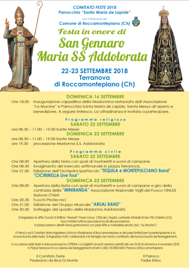 Il sindaco Adamo Carulli annuncia che “La due giorni, 22 e 23 settembre, si svolgerà in contrada Terranova per celebrare San Gennaro e la Madonna Addolorata. Già la settimana scorsa l’associazione “Le Macine” insieme alla Parrocchia ed al Comitato feste hanno inaugurato la cappellina della Madonnina di Terranova, recentemente restaurata, con una messa all’aperto e con la benedizione a cui hanno partecipato anche tutte le autorità locali. Il programma dei festeggiamenti prevede, a partire da domani mattina, 22 settembre, lo svolgimento del mercato settimanale in piazza Terranova e alle ore 21 l’esibizione dell’Orchestra Spettacolo “Tequila e Montepulciano Band” con il Cicirinella Live Tour. Domenica,23 settembre, oltre alle celebrazioni religiose e alla processione dell’Addolorata, alle ore 8, è prevista l’ apertura della festa da parte della banda dell’Associazione Nazionale Vigili del Fuoco Onlus Sezione di Chieti. Alle 20.30 ci saranno i giochi pirotecnici e l’esibizione del gruppo musicale “Arual Band” che propone un repertorio con brani di Rino Gaetano, Mannarino e tanti altri cantautori italiani. In piazza ci saranno stand gastronomici con pizze fritte e mortadella arrosto a cura dell’Associazione “Le Macine!” “.