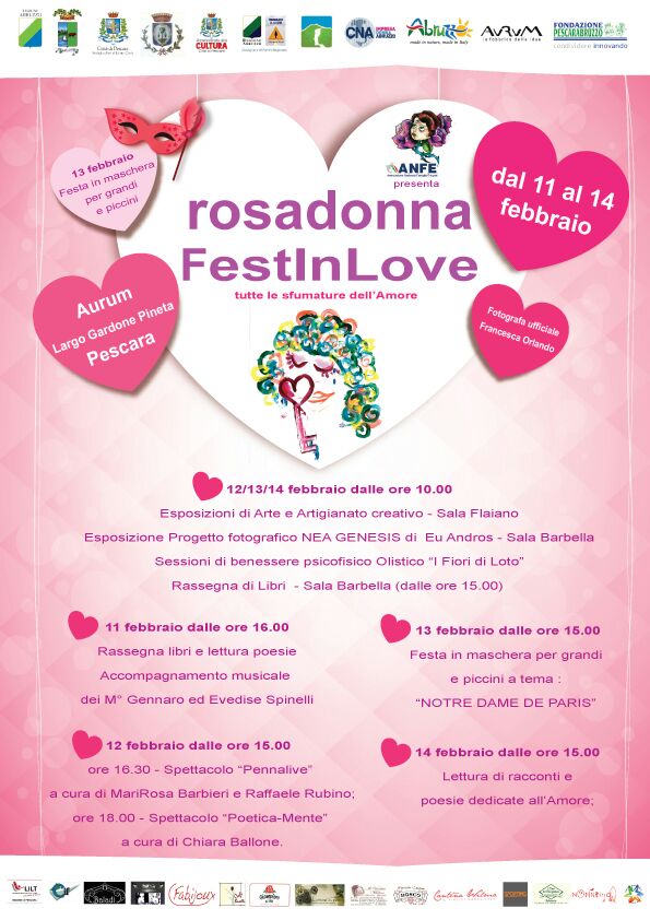 Si inaugura all’Aurum il prossimo 11 febbraio alle ore 16.00, la prima edizione del ”rosadonnaFestInLoveAbruzzo”, organizzato e ideato dall’ANFE di Pescara, in collaborazione con l’Assessore alla Cultura Giovanni di Iacovo e la Commissione Pari Opportunità del Comune di Pescara, presentato oggi a Palazzo di Città in presenza del vicesindaco Antonio Blasioli, della presidente della Commissione Pari Opportunità Tiziana Di Giampietro, di Cinzia Maria Rossi che promuove l’evento come ANFE. Il “rosadonnaFestInLove” é un progetto culturale pedagogico, solidaristico, contro la violenza in genere e per la valorizzazione e la promozione del territorio, delle attività artistiche e dei prodotti locali, si svolgerà all’Aurum, spazio prestigioso, istituzionale e gratuito. Finalmente recuperato e consegnato alla cittadinanza dopo anni di incuria. Quattro giorni di esposizioni di Arte, Artigianato, Fotografia, Benessere, convegni, musica, sport, performance artistiche e degustazioni, musica di giovani cantautori e compositori, tutti i giorni. Durante i pomeriggi rassegna di libri letture di poesie dedicate all’amore . Si segnala il 13 febbraio, martedí “Grande festa di Carnevale” 14 febbraio dalle 15.00 in Sala Tosti “Maratona d’Amore” Ingresso esposizioni e laboratori dalle 10.00 alle 22.00. Alla manifestazione sono invitate le Istituzioni che rappresentano e si interessano della parità di genere sul lavoro e nella società , le Associazioni e chiunque sia interessato alla valorizzazione ed alla promozione del lavoro femminile, come volano di una società democratica.