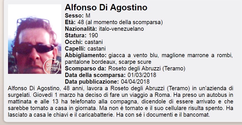 I familiari lanciano un accorato appello affinchè Alfonso Di Agostino, italo-venezuelano di 48 anni scomparso da Roseto degli Abruzzi, venga ritrovato. Dell’uomo , che risiede a Roseto e lavora in un’azienda di surgelati, non si hanno più notizie da oltre un mese. Di Agostino, lo scorso giovedì 1 marzo, ha deciso di fare un viaggio a Roma e sarebbe salito su un autobus in mattinata poi, intorno alle ore 13, ha telefonato alla compagna dicendole di essere arrivato nella Capitale e che sarebbe tornato a casa in giornata. Da quel momento è sparito nel nulla ed il suo telefono cellulare risulta spento. L’uomo avrebbe con sé documenti e bancomat ma avrebbe invece lasciato a casa le chiavi ed il caricabatterie. Gli investigatori stanno vagliando diverse piste tra le quali c’è anche l’ allontanamento volontario.