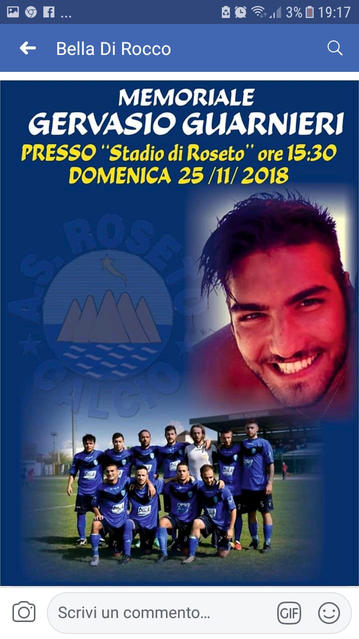 Gervasio giocava nella squadra locale del Roseto ed era molto apprezzato per i suoi modi gentili. Anche per questa ragione il suo allenatore ed i suoi compagni di squadra, in accordo con i suoi parenti stretti, hanno voluto organizzare per domenica prossima presso lo stadio di Roseto degli Abruzzi, una partita commemorativa tra i giocatori del Roseto ed i suoi più cari amici. Appuntamento alle 15.30 allo stadio di Roseto.