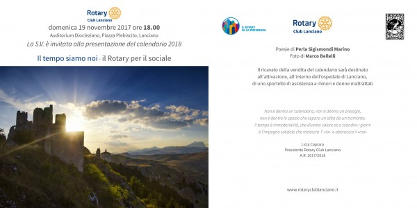 La presidente Caprara spiega che il calendario è “divenuto oggetto da collezione, impreziosito dai versi di Perla Sigismondi Marino e dalle immagini catturate da Marco Bellelli, l’edizione 2018 è agganciata alla realizzazione, all’interno dell’ospedale di Lanciano, di uno sportello di assistenza a minori e donne maltrattati. Un progetto di evidente valenza sociale, ideato per offrire un aiuto qualificato a utenti che subiscono varie forme di violenza, a partire dal bullismo per i più piccoli”.