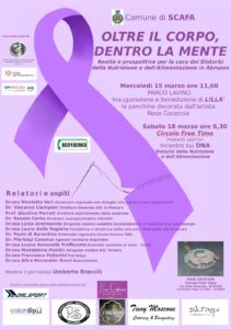 Domani, in occasione della giornata nazionale del Fiocchetto Lilla, dedicata ai disturbi del comportamento alimentare, all’interno del parco naturale del Lavino, sarà inaugurata una “panchina lilla”, restaurata dal nonno di una paziente e decorata dall’artista abruzzese Rosa Cococcia, sulla quale ci sarà il numero verde nazionale 800.180.969 SOS Disturbi Alimentari. Grazie al supporto del Comune di Scafa gli organizzatori hanno deciso di promuovere anche un incontro medico che si terrà sabato 18 marzo.