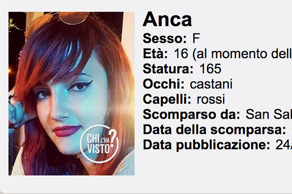 La ragazza si chiama Anca ed è alta 165 cm di altezza, ha occhi castani e capelli rossi. I familiari si sono rivolti alle forze dell’ordine e anche al programma televisivo ” Chi l’ha visto” , in onda su Rai 3 e condotto da Federica Sciarelli, che ha diffuso una foto e una descrizione della sedicenne. I genitori la stavano aspettando ma invano e con il passare dei giorni cresce la loro preoccupazione. Chi dovesse vederla è pregato di avvertire immediatamente le forze dell’ordine.