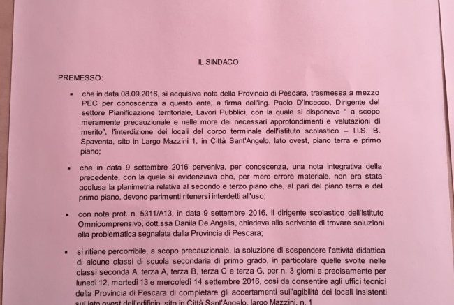 Scuole a Città S.Angelo: Apertura slittata solo per 5 classi della Scuola Media “Giansante” in attesa di ulteriori accertamenti tecnici.