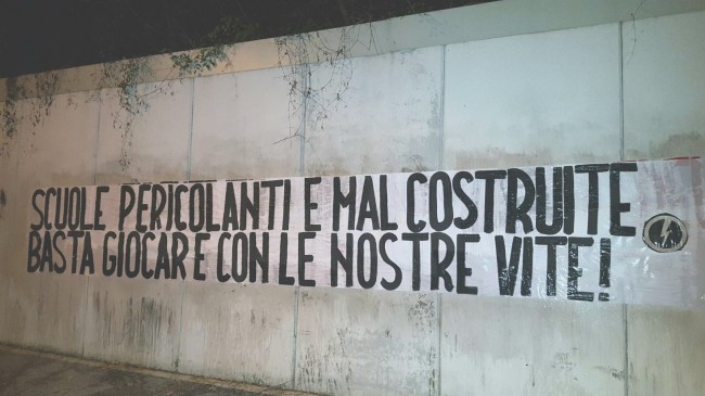 Recitano così gli striscioni affissi dal Blocco Studentesco nelle principali città d’Abruzzo e Molise, striscioni che vogliono evidenziare la gravissima situazione degli edifici scolastici delle due regioni duramente colpite dal recente sisma.