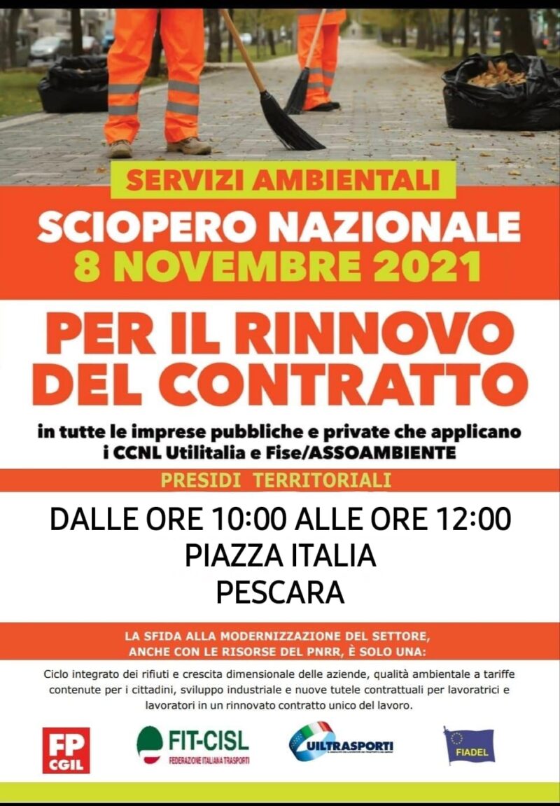 Lunedì 8 novembre sciopero dei lavoratori dei servizi ambientali per il rinnovo del contratto, fermo da 27 mesi. Ritrovo dei lavoratori e dei sindacati in piazza Italia a Pescara. Chiesto un incontro al Prefetto.
