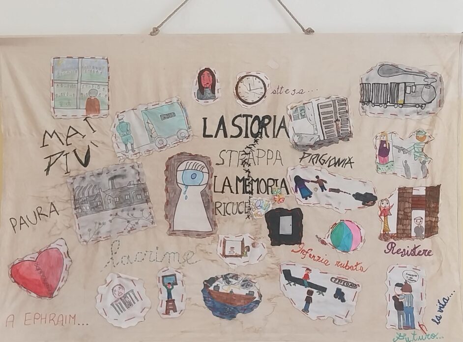 L’opera prodotta dalle due classi dal titolo “La Storia Strappa….La Memoria Ricuce” è il frutto di un progetto trasversale a tutte le discipline nato dal desiderio di avvicinare gli alunni al tema della Shoah, permettendo loro di conoscere in modo adeguato alla loro età, le atrocità subite dal popolo ebraico.