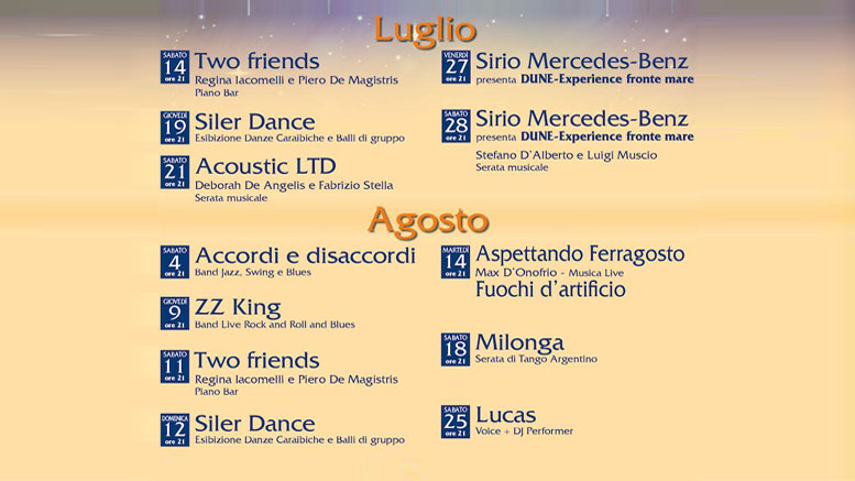 Saranno serate sotto le stelle, dal 14 luglio al 25 agosto, quelle organizzate nella splendida cornice della città Mediterranea ” Le Dune” di Silvi dove saranno numerosi gli appuntamenti culturali e di spettacolo riservati ad un vasto pubblico. Si comincia con la musica di Regina Iacomelli e Piero De Magistris il 14 luglio per proseguire il 19 luglio con l’esibizione di danze caraibiche e balli di gruppo “Siler Dance” e animare l’estate a Silvi con musica jazz, blues, swing e rock.
