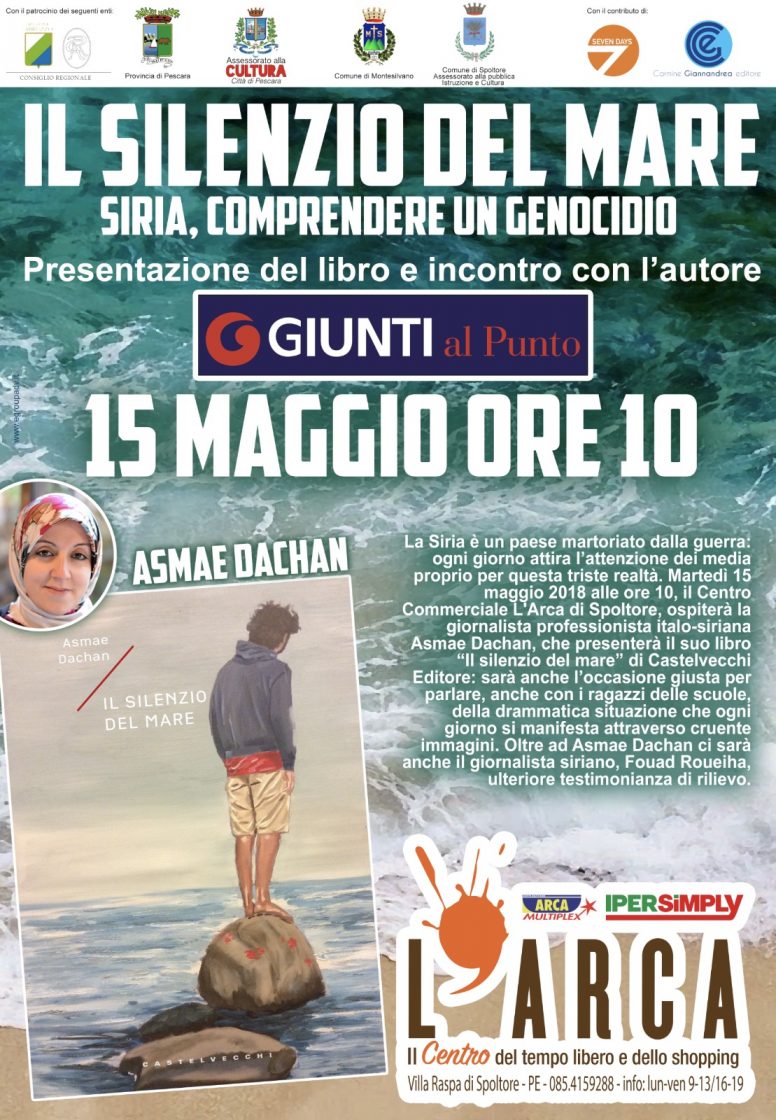 la giornalista professionista italo-siriana Asmae Dachan, infatti, presenterà il suo libro “Il silenzio del mare”di Castelvecchi Editore creando l’occasione giusta per parlare della drammatica guerra in Siria che ogni giorno si palesa alle persone con cruente immagini e notizie frammentarie soprattutto attraverso i social. Oltre ad Asmae Dachan, ambasciatrice di pace, ci sarà anche il giornalista siriano residente a Roma, Fouad Roueiha che sarà ulteriore testimonianza di questa drammatica situazione che coinvolge la Siria, paese martoriato dalla guerra. Ogni giorno i media di tutto il mondo dedicano grandi servizi ad una realtà molto complessa ed articolata: tante le responsabilità ma poche, al momento le soluzioni. L’evento “Il silenzio del mare” – Siria, comprendere un genocidio, voluto fortemente da Renzetti Alessandra, quale giornalista e relatore, insieme al Centro Commerciale L’Arca di Spoltore e la libreria Giunti al Punto, e Carmine Giannandrea Editore si propone di coinvolgere soprattutto le scuole, perché “anche i più giovani devono conoscere”; saranno presenti infatti molti studenti, oltre a quanti hanno il desiderio di saperne di più proprio da chi la guerra l’ha vista e raccontata. Il romanzo attinge alla drammatica realtà della guerra in Siria. Due fratelli, Fadi e Ryma, si uniscono al movimento pacifista che nasce segretamente nei campus universitari e che coinvolge giovani e lavoratori, e iniziano un impegno attivo per la difesa dei diritti umani, sognando che la Siria riacquisti la libertà e si affranchi dall’oppressione della dittatura. Ma il loro sogno svanisce in breve: scoperti e minacciati dal regime, sono costretti a fuggire dalla repressione che presto si trasforma in una feroce guerra, a cui si aggiunge l’orrore del terrorismo. In questa realtà si intrecciano sentimenti contrastanti, odio, amore, paura che creano momenti di forte commozione.