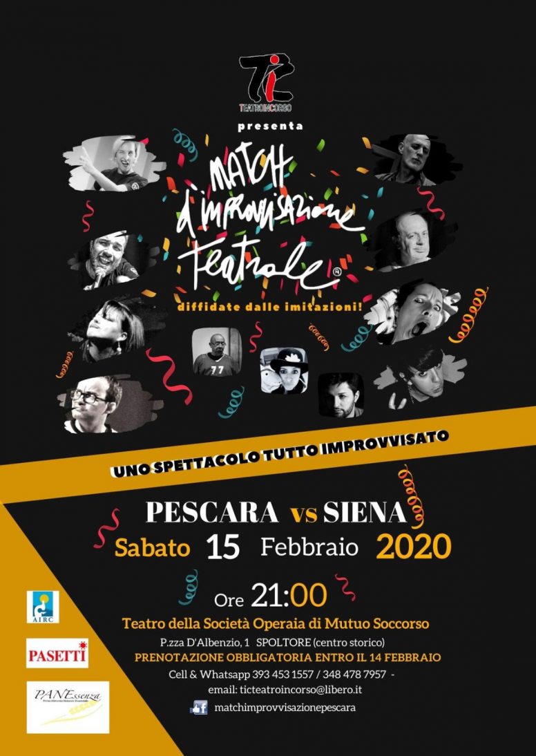 La squadra di Pescara composta da Paolo Diodato, Anna Cellini, Luca Memmo Di Blasio e Pierluigi Chiavaroli si incontrerà con quella di Siena capitanata dal famoso attore senese Francesco Burroni che ha portato i Match in Italia circa 34 anni fa, lo spettacolo teatrale più rappresentato al mondo. Mara, la presidente TIC TeatroInCorso, Associazione di Promozione Sociale è molto soddisfatta del successo delle varie attività proposte da TIC, che ormai da anni è presente sul territorio abruzzese e si occupa di diffondere, con amore, professionalità ed entusiasmo, l’arte dell’improvvisazione teatrale attraverso corsi sia per bambini, ragazzi e adulti e soprattutto spettacoli. “L’improvvisazione Teatrale ha un alto valore formativo e promuove la crescita personale il tutto grazie ad una grande dose di divertimento”, sostiene la stessa. Sabato sera la musica, totalmente improvvisata sarà dell’eccellente maestro Elio De Pasquale e la frizzante maestra di cerimonia sarà Giulia Pascucci. Invece a decidere le sorti della serata ci sarà l’arbitro Roberto Bechi, insieme ovviamente al pubblico che sarà il vero protagonista della serata. Parte del ricavato andrà come sempre all’AIRC. Per informazioni e prenotazioni: matchdimprovvisazioneteatrale.it 3934531557