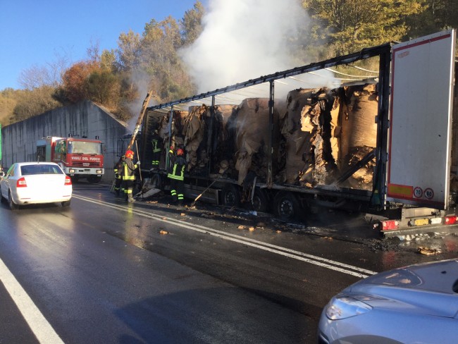 La chiusura é stata necessaria per consentire le operazioni di rimozione di un mezzo pesante incendiato. Il traffico e’ deviato sulla viabilita’ secondaria con uscita obbligatoria a Civitella Roveto per il traffico in direzione Sora e a Morino per il traffico in direzione Avezzano. Il sinistro ha riguardato un mezzo pesante che si e’ incendiato per cause in corso di accertamento e non ha coinvolto altri veicoli. Il personale Anas e’ intervenuto sul posto al fine di ripristinare la circolazione nel piu’ breve tempo possibile. A causa del rogo, di cui ancora non si conoscono le cause, sono andate distrutte circa 250 tonnellate di carta. Il conducente del mezzo appena ha notato il fumo fuoriuscire dal rimorchio ha accostato immediatamente il mezzo sul ciglio della strada e, dopo essersi messo in salvo, ha allertato i soccorsi. Sul posto sono intervenuti i vigili del fuoco di Avezzano con tre mezzi, due autobotti ed una autopompa. Nel giro di mezz’ora i vigili sono riusciti a domare le fiamme che hanno distrutto completamente il mezzo. Lievi disagi si sono registrati al traffico poiché la superstrada è rimasta chiusa per mezz’ora per consentire ai vigili le operazioni di spegnimento e di sgombero della carreggiata. Il conducente del mezzo, originario del frusinate, in seguito all’accaduto ha dovuto ricorrere a cure di pronto soccorso, ma non è in gravi condizioni. Il carico di carta, proveniente dalla cartiera di Sora, era destinato a rifornire gli esercizi commerciali della Marsica. Indagini sono in corso da parte dei vigili del fuoco e dei carabinieri della locale stazione per accertare le cause del rogo.