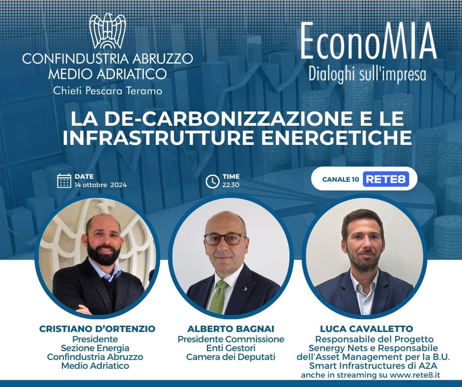 La de-carbonizzazione e le infrastrutture energetiche: è il tema della seconda puntata della V stagione ‘EconoMIA, dialoghi sull’impresa’, format tv di Confindustria Abruzzo Medio Adriatico e Rete8. Appuntamento lunedì 14 ottobre alle 22:30, sul canale 10 del digitale terrestre