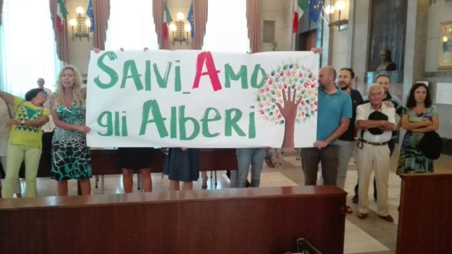 I manifestanti hanno occupato la sala del Consiglio Comunale di Pescara per ribadire, grazie a uno striscione di dieci metri con tutte le loro firme, il loro no al taglio degli alberi da parte dell’amministrazione comunale. Dopo il sit-in sotto Palazzo di Città, i rappresentanti del Coordinamento “Salviamo gli Alberi” sono saliti su in Comune, dove era in corso il Consiglio Comunale che è stato interrotto. Alla fine il sindaco Alessandrini ha incontrato tutti i manifestanti accordando un sopralluogo già nel pomeriggio. Ieri i rappresentanti del Coordinamento avevano puntato il dito su alberi sbagliati che, a loro detta, sono stati tagliati; a questo aveva fatto eco l’assessore Di Pietro la quale ha assicurato, invece, che nessuna pianta sana è stata abbattuta.