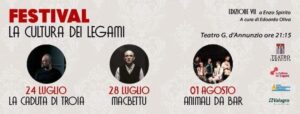 La settima edizione del festival di teatro contemporaneo “La Cultura dei Legami” è uno degli appuntamenti più significativi della scena culturale regionale, ideato e diretto artisticamente da Edoardo Oliva, attore e regista, per la prima volta d’estate, en plen air, che esordisce quest’anno con tre spettacoli teatrali, all’interno del cartellone estivo dell’Ente Manifestazioni Pescaresi.