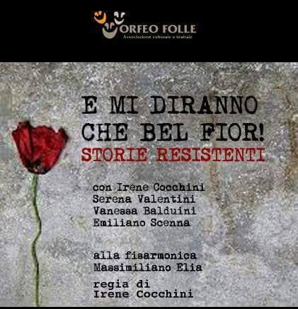 “E mi diranno che bel fior” é il titolo dello spettacolo che sarà portato in scena dalla Compagnia dell’Orfeo Folle. Si tratta di una pièce sulla Resistenza in Abruzzo, le origini della Brigata Maiella, la battaglia del Sangro, la strage di S.Agata a Gessopalena ed episodi vari avvenuti in vari paesi della nostra Regione durante il fascismo e la Seconda Guerra Mondiale. Il tutto attraverso testimonianze autentiche tradotte in monologhi e voci narranti. Alla fisarmonica Massimiliano Elia, sul palco Irene Cocchini, Emiliano Scenna, Serena Valentini e Vanessa Balduini. La regia é di Irene Cocchini. Inizio spettacolo, lunedì 25 aprile alle ore 21.00