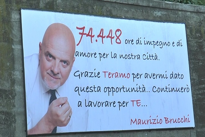 «74.448 ore di impegno e di amore per nostra città, grazie Teramo per avermi dato questa opportunità … continuerò a lavorare per TE». Questo è quanto scritto sui due enormi manifesti uno affisso in via Po e l’altro in via De Gasperi apparsi da alcuni giorni, dove c’è la foto utilizzata da Brucchi nella campagna elettorale del 2014 che l’ha visto confermato alla guida dell’amministrazione comunale. Il messaggio che accompagna l’immagine fa il conto dell’esperienza prematuramente conclusa.