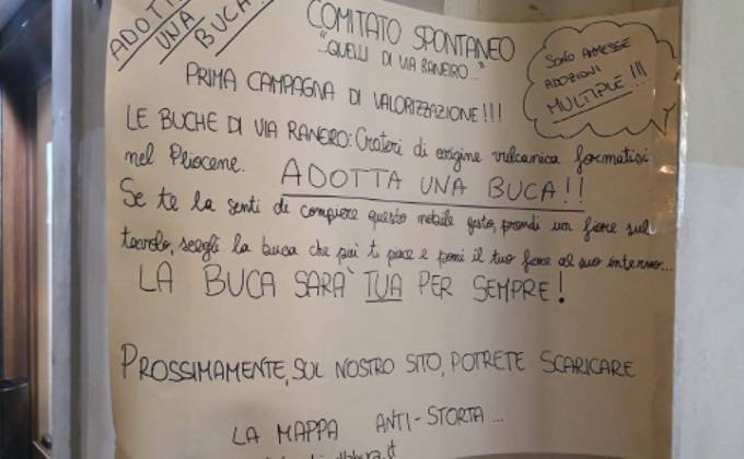 A Teramo c’è chi ha deciso di prendere con ironia la drammatica situazione delle strade in città. È il caso di Via Raniero, una parallela di Corso San Giorgio.