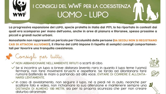 Un animale, protetto a livello europeo e dal 1971 anche in Italia (dove era sull’orlo dell’estinzione), sta progressivamente e naturalmente riconquistando spazi dai quali era scomparso per mano dell’uomo da molti decenni, anche in aree di pianura e litoranee, spesso prossime a piccoli e grandi nuclei urbani. Per questo il Wwf ha lanciato la proposta di creare una task force provinciale formata dagli enti che si occupano di gestione faunistica, dall’università e dai vertici delle aree protette per gestire al meglio la presenza di questo predatore. Nel frattempo sempre il WWF , con i suoi esperti, ha realizzato un vademecum con una prima serie di consigli utili per favorire una tranquilla coesistenza tra l’uomo e il lupo, indicazioni a cittadini, escursionisti, allevatori, ma anche agli amministratori locali, cui spetta l’onere di informare i cittadini e di coordinarne i comportamenti. I consigli del WWF riguardano la protezione delle greggi con recinti elettrificati, la gestione degli scarti di cibo e degli alimenti per cani e gatti che non vanno mai abbandonati nell’ambiente, il comportamento da adottare in caso di eventuali incontri con il lupo.