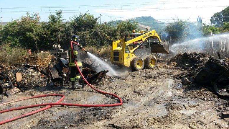 A fuoco un deposito di materiali ed attrezzature di un’impresa edile, posta tra la SS80 e la linea ferroviaria Teramo/Giulianova, all’altezza di Piano d’Accio , nel comune di Teramo, dove si trovavano materiali di risulta di varia natura che erano depositati su una superficie di circa 3.000 mq.