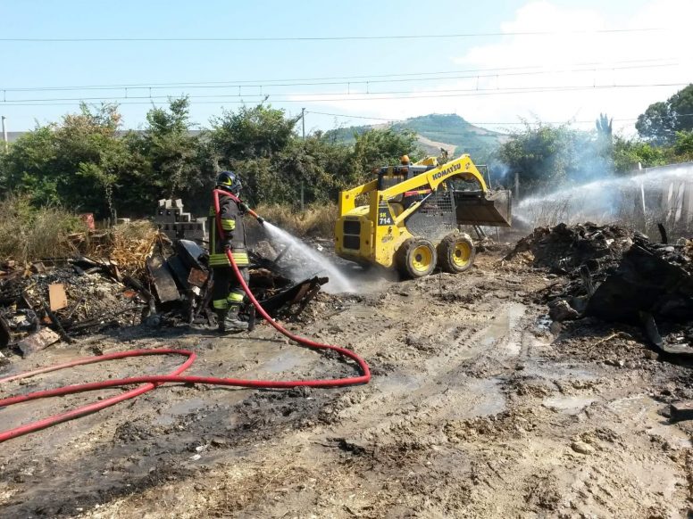 A fuoco un deposito di materiali ed attrezzature di un’impresa edile, posta tra la SS80 e la linea ferroviaria Teramo/Giulianova, all’altezza di Piano d’Accio , nel comune di Teramo, dove si trovavano materiali di risulta di varia natura che erano depositati su una superficie di circa 3.000 mq.