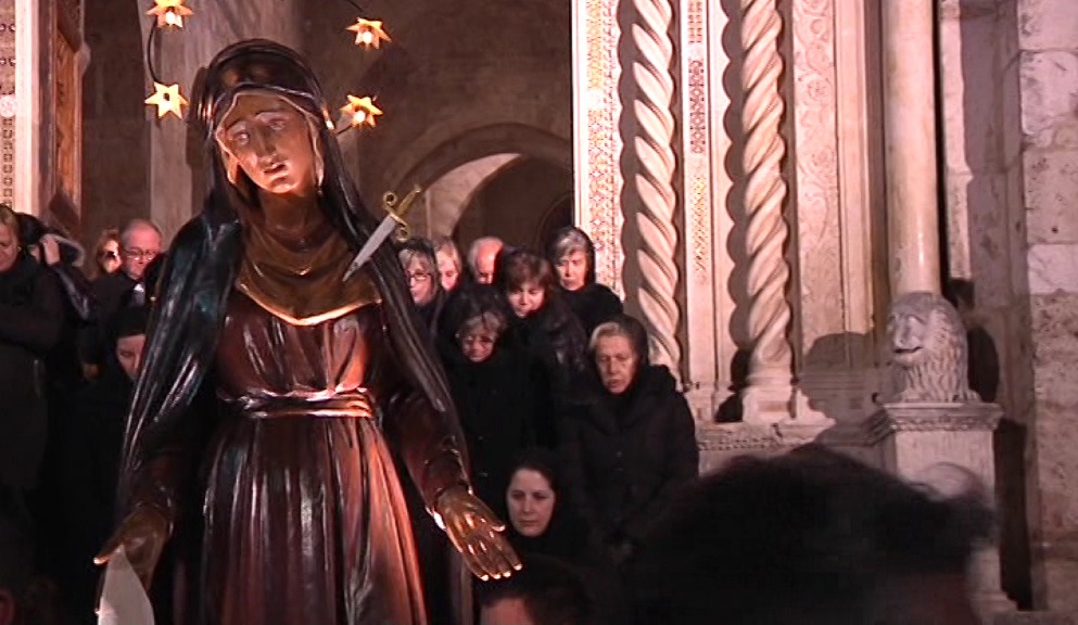 Una folla di pellegrini, percorrerà le vie del centro storico cittadino al seguito della statua della Madonna portata a spalla dalle donne: questo è senza ombra di dubbio il corteo religioso più sentito dai fedeli teramani, che si rinnova dal 1260. Dalla Cattedrale e lungo il percorso tradizionale delle sette chiese centrali, il vescovo di Teramo e Atri, monsignor Michele Seccia, guiderà i pellegrini e i parroci nel peregrinare della madre di Cristo. Questo particolare rito, semplice e commovente, rappresenta il disperato cammino della Madonna alla ricerca del figlio condannato a morte e per questo anche il dolore di tutte le madri che hanno perso il proprio figlio. La Madonna sosterà in sette chiese del centro storico in cerca del Figlio: Duomo, Sant’Anna, San Francesco, San Luca, San Domenico, Madonna delle Grazie e Annunziata. Il vescovo come da tradizione verrà seguito lungo il percorso dai componenti della Confraternita dei Cinturati che organizza l’antica processione mattutina, il pellegrinaggio si snoderà lungo le vie del centro cittadino, fino al rientro in Duomo dopo circa 3 ore di rito. nella serata di venerdì, alle 18.30, si svolgerà la Processione del Cristo Morto, che partirà dalla Chiesa dell’Annunziata mentre sabato, alle 21:30 in Cattedrale si svolgerà la solenne veglia pasquale.
