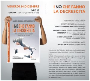 Venerdì 14 dicembre alle ore 17, nella sala convegni Hotel Abruzzi, il Prof.re Stefano Cianciotta e Alberto Brambilla presenteranno il nuovo libro scritto a quattro mani “I No che fanno la decrescita”. Il libro passa in rassegna i più recenti ‘no’ che hanno impedito all’Italia di crescere e di promuovere uno sviluppo al passo con quello dei Paesi occidentali più progrediti. Per invertire la tendenza, gli autori (ri)lanciano una serie di proposte utili e potenzialmente proficue su fisco, spesa pubblica, mercato del lavoro, giustizia, scuola e università. All’incontro saranno presenti Giuseppe De Filippi, vicedirettore del Tg5, Paolo Di Giannantonio, giornalista e inviato speciale del Tg1, Massimo Di Cintio, Delegato Ferpi Abruzzo/Molise, Enrico Dolfi, direttore relazioni istituzionali Bombardier Rail Italia, Simone Gambacorta, giornalista; introduce e coordina Antimo Amore, giornalista Rai.