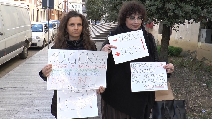 Leda Ragas e Mara Cicconi, con tanto di striscioni si sono ritrovate fuori alla sede di via Carducci, per spingere il Comune alla divulgazione dei dati sulle verifiche sismiche delle scuole teramane. Risultati che -secondo il comitato- il Comune ha da oltre un mese.