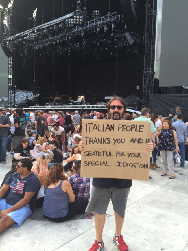 Un semplice cartello di cartone con su scritto, in pennarello: “Italian People thanks you and is grateful for your special dedication”. Ad esibire lo speciale ringraziamento Pierluigi De Luca al concerto di Springsteen a New York. Il rocker statunitense ha notato il messaggio e a fine concerto ha voluto incontrare De Luca per manifestare tutta la sua solidarietà.