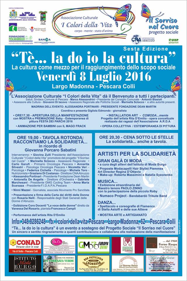 A Pescara torna “Tè… la do io la cultura! – La cultura come mezzo per il raggiungimento di uno scopo sociale”, la raccolta fondi a cura dell’associazione “I colori della vita” , giunta alla sesta edizione. L’evento gode del patrocinio del Comune di Pescara e altri Enti e sponsor privati. In via Largo Madonna 62, si svolgerà un salotto culturale dedicato alla promozione di artisti e artigiani e alla sensibilizzazione dei cittadini per finanziare il progetto sociale “Il sorriso nel cuore”, rivolto al sostegno delle pazienti oncologiche e dei loro familiari, che l’associazione porta avanti dal 2009. L’assessore comunale alla Cultura Giovanni Di Iacovo, e Ilaria Pizzolante in rappresentanza dell’associazione ,presieduta da Giustina Zulli, hanno illustrato le iniziative in programma.