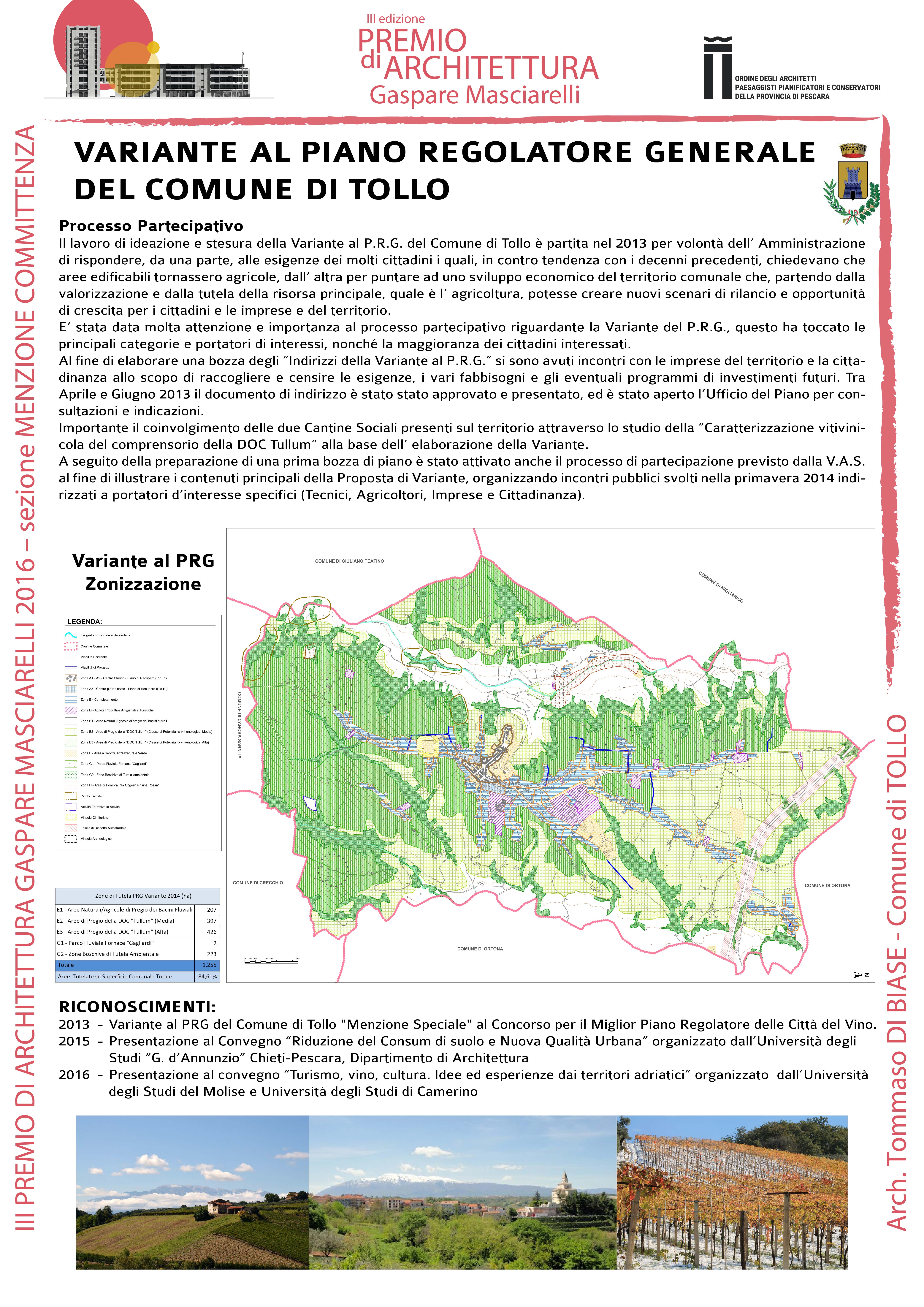Importante riconoscimento per il Comune di Tollo, tra i vincitori della terza edizione del Premio di architettura “Gaspare Masciarelli”. Ad essere premiato è il progetto ,elaborato dall’architetto Tommaso Di Biase in collaborazione con l’ufficio tecnico del Comune, riguardante la variante al piano regolatore generale . Il riconoscimento consegnato durante una cerimonia all’Urban box di Pescara.