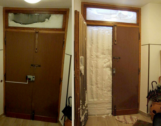La porta murata dalla neve scesa abbondante nel corso della notte, ecco lo spettacolo al quale hanno dovuto assistere increduli i componenti di una famiglia a Torrebruna nel chietino, comune di 859 abitanti a circa 850 metri di altezza. Alla fine i residenti sono stati costretti a spalare la neve per uscire di casa e rivedere la luce. La foto, scattata da Alessia D’Ortona, la padrona di casa, é diventata virale sul web: