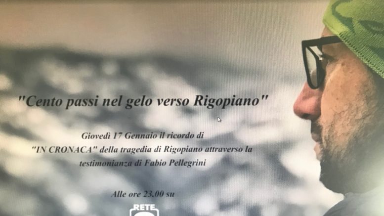 Fabio Pellegrini, istruttore di scialpinismo di Loreto Aprutino, alla notizia della valanga non esitò un istante, si vestì in fretta lasciando a casa la moglie e i suoi due figlioli, e si mise sulla strada per Rigopiano. Il suo intervento si rivelò fondamentale perché fu lui a fare da guida alla colonna dei soccorritori già sul posto, ma non fu un’impresa facile, perché, in piena notte, con temperature sotto lo zero e la neve copiosa che ancora cadeva dal cielo, Fabio e gli altri uomini dei soccorsi, percorsero 18 chilometri a piedi, dal punto di ritrovo a Penne fino al luogo della tragedia. Fabio, intervistato da Jennifer Di Vincenzo, è tornato per la trasmissione “In Cronaca” in onda questa sera, eccezionalmente alle 23.00 invece che alle 22.3o, su quella maledetta strada dando sfogo ai suoi pensieri e ai suoi ricordi. Non ha mai ricevuto riconoscimenti ufficiali per quella straordinaria impresa, ma si consola con la gratitudine che quotidianamente gli viene mostrata dalla gente, in particolare dai parenti delle vittime, alcune tra loro suoi grandi amici, ed è stato proprio il pensiero di quegli amici, sepolti sotto le macerie dell’Hotel, a dargli la forza: