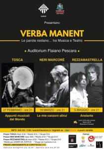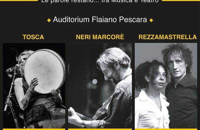 Tre eventi culturali che si terranno nei prossimi mesi all’Auditorium Flaiano di Pescara alle ore 21. Il primo con Tosca, cantante e attrice dalla voce straordinaria, all’Auditorium Flaiano di Pescara, mercoledì 27 febbraio. Tosca porterà i suoi “Appunti musicali dal mondo”: uno spettacolo che ha già fatto registrare il tutto esaurito all’Auditorium Parco della Musica di Roma, in cui le parole, pur provenienti dalle lingue più diverse, trascenderanno ogni confine, trascinando il pubblico nell’incanto profondo e rigeneratore della tradizione. Ad aprire l’esibizione di Tosca saranno i giovani attori dell’Accademia teatrale Arotron con un estratto dello spettacolo “Olea et labora”. Il secondo con Neri Marcorè, artista tra i più intelligenti e amati dal pubblico italiano, con “Le mie canzoni altrui”. Neri Marcorè si esibirà martedì 19 marzo a Pescara con un concerto-spettacolo in acustico, portando sul palcoscenico dell’Auditorium Flaiano le canzoni che hanno costituito la colonna sonora della sua vita: da De André a Gaber, passando per De Gregori, Dalla, Fossati, James Taylor e altri autori, alla cui poesia l’artista si rivolge per trovare le parole che raccontino la vita. E infine, Antonio Rezza e Flavia Mastrella. Artisti geniali, premiati con il Leone d’Oro alla carriera alla Biennale di Venezia nel 2018, con “Anelante” Antonio Rezza propone per domenica 5 maggio uno spettacolo scritto da lui stesso in stretta relazione con l’habitat scenico creato da Flavia Mastrella, mostrando il lato perturbante della parola, la sua potenzialità di mistificare e colpire, quando è incompresa da coloro stessi che la pronunciano. Il direttore artistico e fondatore dell’Accademia teatrale Arotron, Franco Mannella, dichiara: