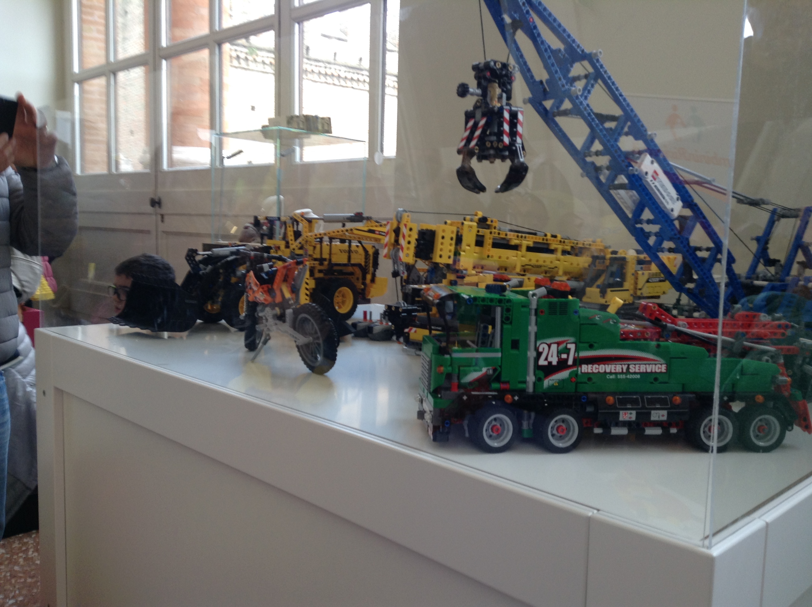 Alessio parlando della sua grande passione spiega ” Io possiedo i lego technic che sono quelli che mi affascinano in modo particolare. Ne ho diversi, ma alla mostra mi hanno permesso di portarne solo 6: ne troviamo 2 a controllo remoto cioè a distanza con un telecomando, 3 senza il controllo remoto ma funzionano ugualmente ma devi inserire i vari comandi sul “veicolo” stesso e invece l’ultimo e senza batterie ed è il più piccolo della mia collezione. Alla mostra di Rimini ho portato 1. 8043, un escavatore. E’ il più vecchio della collezione ed anche uno dei più piccoli, possiede 1123 pezzi. Questo è uno dei due lego con il controllo remoto. 42030, cioè una ruspa gommata. E’ uno dei più nuovi della mia collezione e possiede all’incirca gli stessi pezzi cioè 1636. Questo è il secondo lego a controllo remoto. 42008, una gru. E’ il più grande lego della collezione infatti possiede 2606 pezzi e raggiunge con il suo braccio circa 75 centimetri di altezza. Questo è il primo dei tre lego che non possiedono il controllo remoto. 42042 è anch’essa una gru ma si può muovere tramite dei cingoli. Anche questo lego uno dei più alti della mia collezione infatti può raggiungere un’altezza di circa 60 centimetri e possiede 1401 pezzi. Questo è il secondo lego che non possiede il controllo remoto. 42008, invece, è un carro attrezzi. Anche questo lego è uno dei più piccoli ma uno dei più particolari perché è il primo lego che funziona ad aria cioè che possiede un pistoncino che crea area che dopo, tramite tubicini, arriva ai vari sistemi che lo azionano. Esso è composto dai 1276 pezzi. Questo è l’ultimo lego che non possiede il controllo remoto. 42007 è una moto. E’ il lego più piccolo che ho nella mia collezione infatti è composto da 253 pezzi. E’ l’unico lego che non possiede le batterie ” .