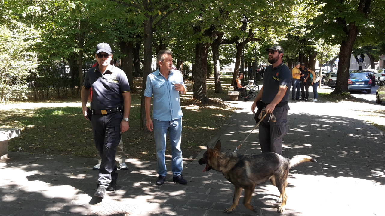 Unità cinofile della Guardia di finanza in azione in piazza Torlonia ad Avezzano per effettuare controlli contro lo spaccio di sostanze stupefacenti.