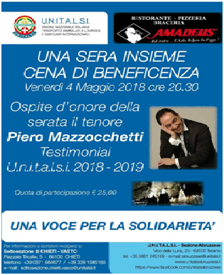 Una parte dell’incasso della serata servirà a contribuire al finanziamento delle attività benefiche dell’associazione, che si occupa del trasporto degli ammalati a Lourdes e Santuari Internazionali. I proventi ottenuti saranno impiegati, in particolare, per offrire un supporto economico a chi ne ha più bisogno, al fine di offrirgli la possibilità di recarsi nei luoghi di culto, potendo, peraltro, beneficiare di assistenza personale gratuita H24 da parte dei volontari. Per partecipare alla serata è necessario presentarsi con apposito ticket ottenibile pagando 25 euro (menù bambini fino a 12 anni 15 euro) . La serata sarà allietata dalla presenza del noto tenore abruzzese Piero Mazzocchetti: