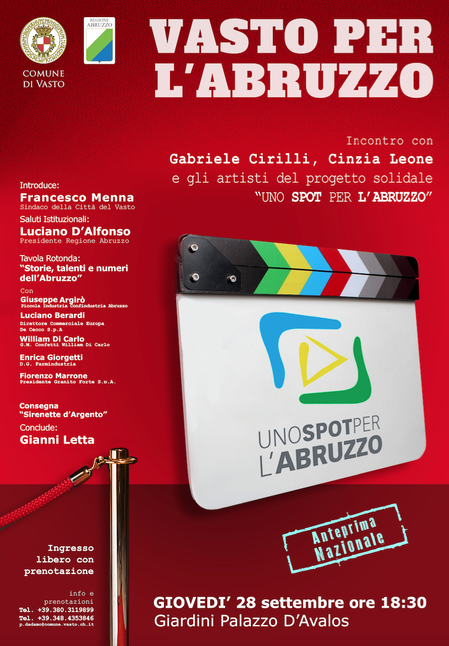 Giovedì prossimo alle ore 18.30, nella meravigliosa cornice dei Giardini D’Avalos di Vasto, verrà presentata l’iniziativa sociale “Uno spot per l’Abruzzo”, lanciata dal regista Walter Nanni, e che ha coinvolto autori, attori, filmmaker, addetti del mondo del cinema e della televisione, che hanno messo a disposizione il proprio impegno per raccontare all’Italia e al mondo la straordinaria bellezza dell’Abruzzo. Saranno presenti gli attori Gabriele Cirilli e Cinzia Leone, tra i primi artisti a sostenere con grande entusiasmo il progetto solidale. “Uno Spot Per l’Abruzzo” che ha già ottenuto grande attenzione da media nazionali e internazionali, verrà raccontato dagli stessi autori: sarà proiettato, inoltre, in anteprima nazionale, sul maxi schermo allestito per l’occasione, il nuovo spot girato sulla Costa dei Trabocchi con la regia di Pierluigi Di Lallo, dal titolo “Mamma che silenzio”, con protagonisti proprio la Leone e Cirilli e la voce di Roberto Pedicini. Durante l’incontro pubblico, che vedrà la presenza delle massime autorità istituzionali regionali, tra cui il Presidente Luciano D’Alfonso ci sarà un vero e proprio talk show con protagonisti imprenditori che rappresentano l’Abruzzo nel mondo e con i rappresentanti delle associazioni di categoria: una testimonianza diretta sulla storia, sui sogni, sulle difficoltà e sulle potenzialità dell’economia abruzzese. Nel corso dell’evento verrà consegnata la “Sirenetta d’Argento” a 10 abruzzesi che si sono distinti nel campo della cultura, delle arti, del turismo, del lavoro e del sociale. L’opera “La Sirenetta d’Argento” s’ispira alla statua della bagnante che domina il litorale di Vasto. Interverrà alla manifestazione e concluderà l’evento il dott. Gianni Letta.