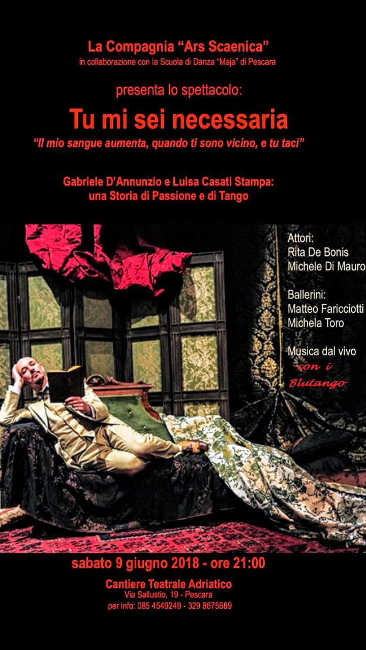 In un clima sognante di inizi Novecento, Gabriele D’Annunzio incontra Maria Luisa Casati Stampa, da lui soprannominata mitologicamente Corè, la quale lo inizia al Tango Argentino, questa sconosciuta e sensuale danza, in voga nelle principali capitali europee del tempo, ma addirittura proibita in Italia dal Papa. D’Annunzio rimane completamente affascinato dal peccaminoso ballo,che gli sembrò un’apoteosi di sensualità, nonché dalle movenze della nobildonna. Lo spettacolo, tramite la musica dal vivo del tango, la voce narrante e la danza ripercorre le tappe salienti di questa scandalosa e particolare storia d’amore. La pièce, dal titolo “Tu mi sei necessaria”, è una produzione della Compagnia “Ars Scaenica”, in collaborazione con la scuola di danza “Maja” di Pescara. Sul palco troveremo gli attori Rita De Bonis e Michele Di Mauro con i ballerini Matteo Faricciotti e Michela Toro e l’accompagnamento musicale dei Blutango. L’appuntamento è dunque per sabato 9 giugno alle ore 21.00 presso il Cantiere Teatrale Adriatico, in via Sallustio 19 a Pescara Portanuova. Per informazioni e prenotazioni: tel. 348/7127076 oppure info@tamtamcom.com.
