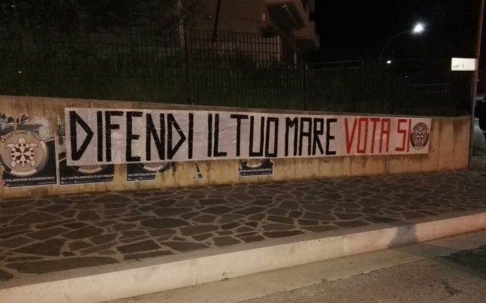 Per ribadire la posizione del movimento in occasione dell’imminente referendum sulle trivellazioni petrolifere in prossimità delle coste, che avrà luogo domenica 17 aprile, CasaPound ha affisso uno striscione a Vasto.