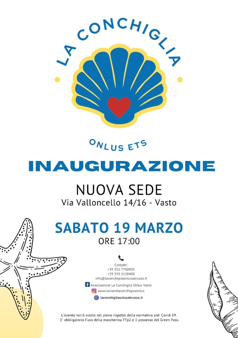 Sabato prossimo a Vasto sarà inaugurata la nuova sede de la “Conchiglia ETS”. L’associazione ha scelto due date simboliche per l’apertura e l’inizio delle attività: il 19 e 21 marzo.