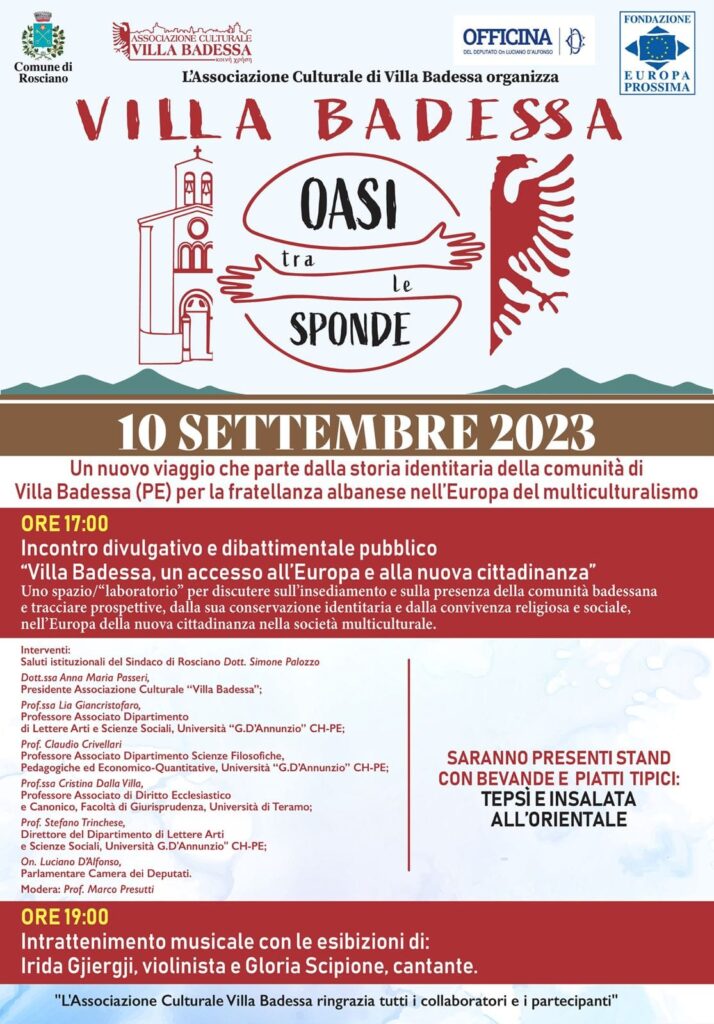 Interessante iniziativa domenica prossima 10 settembre nella frazione di Villa Badessa nel comune di Rosciano. L’associazione culturale del posto ha organizzato “Villa Badessa Oasi tra le sponde”, un intrigante viaggio che parte dalla storia identitaria della comunità di Villa Badessa per la fratellanza albanese nell’Europa del multiculturalismo. L’incontro inizierà alle 17. Tra i relatori, i professori, Lia Giancristofaro e Stefano Trinchese. Previsto anche l’intervento del deputato Luciano D’Alfonso. Dalle 19 ci sarà spazio per un intrattenimento musicale della violinista Irida Gjiergji e la cantate Gloria Scipione.