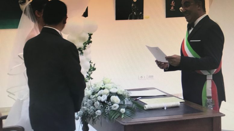 La prima cosa che sarà venuta in mente a quanti ieri pomeriggio si sono visti arrivare Vincenzo Olivieri, in sella ad una bici, nella veste del suo personaggio Don Mattegno (chiaro il riferimento al Don Matteo di Rai Uno), é stata – ma lo sta facendo davvero! Eh si perché Vincenzo Olivieri é fatto così, non fa mai nulla di scontato e banale. Danny Manzo, insegnate di musica, 53 anni ed ex batterista di Drupi, un giorno gli ha detto – mi vorresti sposare? ed Olivieri, anzi Don Mattegno, non ci ha pensato due volte. Ricevuta la delega dal sindaco Alessandrini, come prassi, é arrivato puntuale intorno alle 18.30 nella suggestiva sala degli alambicchi dell’Aurum di Pescara e dopo aver parcheggiato la bici, é tornato per un attimo serio e con la fascia tricolore d’ordinanza ha seguito con estrema professionalità tutto il rituale convenuto. Danny Manzo e la sua consorte Giulia Lorubbio, oltre a tutti gli invitati, hanno gradito coscienti del fatto che una giornata così resterà indimenticabile, anche grazie alla simpatia del loro amico Vincenzo.