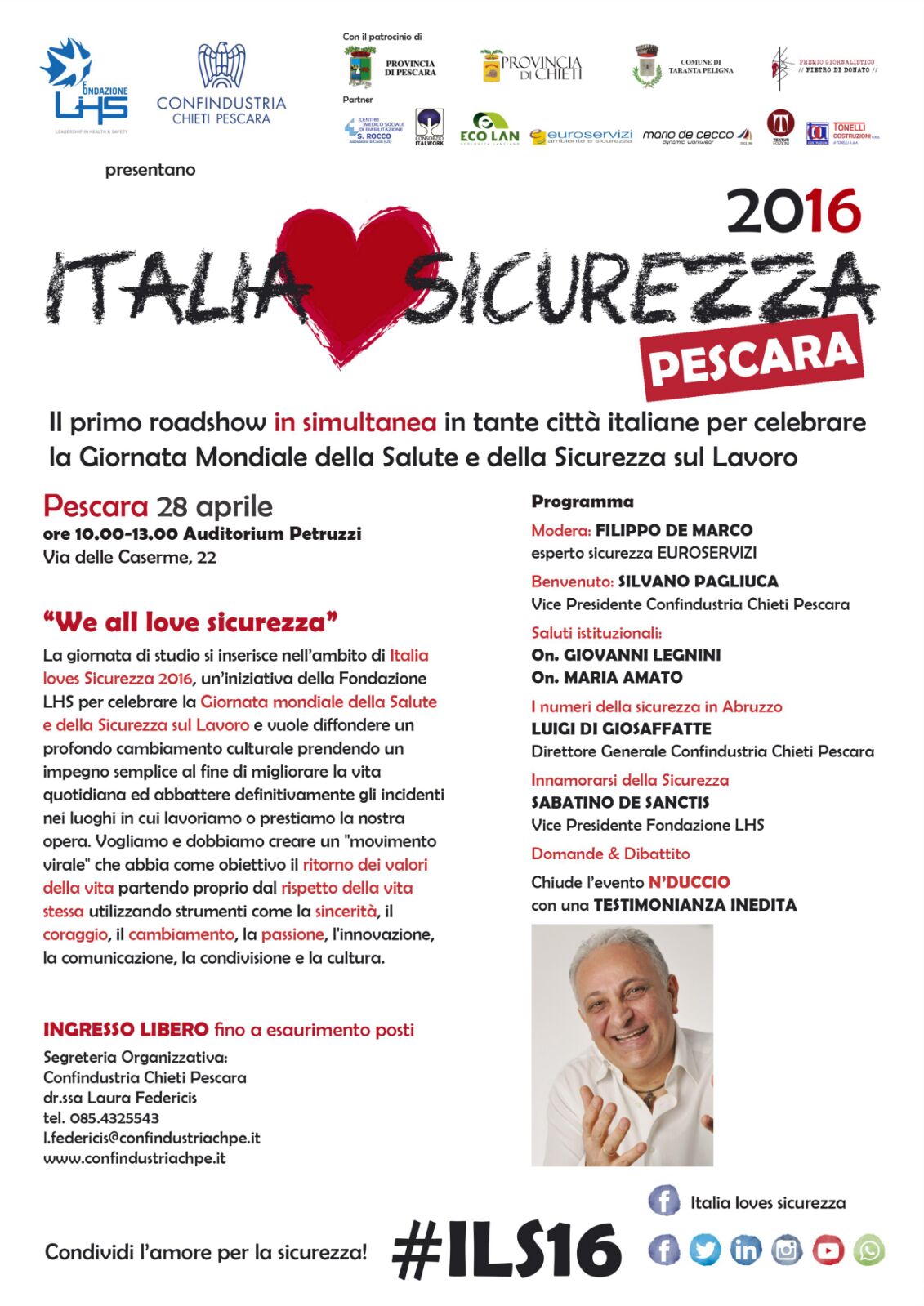 Si chiama we all love sicurezza la giornata di studio in programma oggi a Pescara per celebrata la giornata mondiale della salute e della sicurezza sul lavoro promossa dalla Fondazione LHS e da Confindustria. Un simposio ospitato dall’auditorium Petruzzi di via delle Caserme. Si tratta del primo road show che si svolge in simultanea in tante città italiane per discutere su problematiche importanti .Il direttore generale e il vice presidente vicario di Confindustria Chieti Pescara Luigi Di Giosaffatte e Silvano Pagliuca hanno ricordato i dati di Inail a cui ieri si sono aggiunti quelli del centro studi ” Ciancaglini” della Cisl , dai quali emerge una diminuzione del numero di infortuni in Abruzzo: 15.717 nel 2014, mentre aumentano le malattie professionali. Il vice presidente della Fondazione LHS Sabatino De Sanctis , che ha promosso l’evento a livello nazionale, ha parlato dell’importanza della prevenzione e del cambiamento di mentalità sia dei lavoratori che dei datori di lavoro. Tra i relatori lo showman abruzzese N’duccio, al secolo Germano D’Aurelio, il quale ha raccontato la drammatica morte del padre in un incidente agricolo.