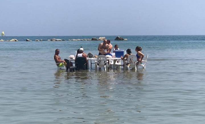 Martinsicuro: impazza sul Web la foto che ritrae un gruppo di amici in un picnic davvero speciale… Vista mare, anzi sul mare con tanto di sedie e tavola imbandita.