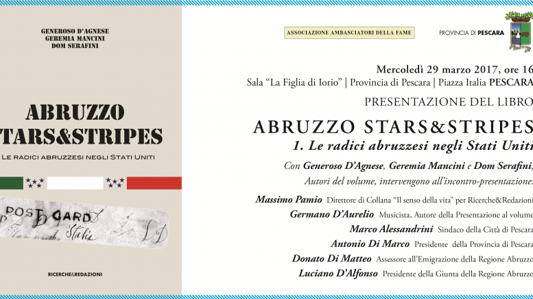 Mercoledì 29 marzo 2017 alle ore 16 a Pescara, presso la Sala “La Figlia di Iorio” del Palazzo della Provincia di Pescara in Piazza Italia, si terrà la presentazione del libro “ABRUZZO STARS&STRIPES” di Generoso D’Agnese, Geremia Mancini e Dom Serafini, volume edito per i tipi della casa editrice teramana Ricerche&Redazioni nella Collana “Il senso della vita” diretta da Massimo Pamio. All’incontro, organizzato dall’Associazione “Ambasciatori della Fame” e patrocinato dalla Provincia di Pescara, prenderanno parte, insieme ai tre autori, Massimo Pamio e Germano D’Aurelio (’Nduccio) che hanno firmato due interessanti contributi introduttivi al volume. Porteranno il loro saluto il Sindaco di Pescara Marco Alessandrini, il Presidente della Provincia di Pescara Antonio Di Marco, l’Assessore regionale all’Emigrazione Donato Di Matteo, il Presidente della Giunta regionale d’Abruzzo Luciano D’Alfonso.