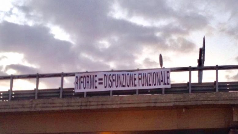 E’ apparso sul ponte Risorgimento a Pescara e reca la scritta ” Riforme=Disfunzione funzionale” il lenzuolo di benvenuto steso per accogliere il premier Matteo Renzi oggi in città.