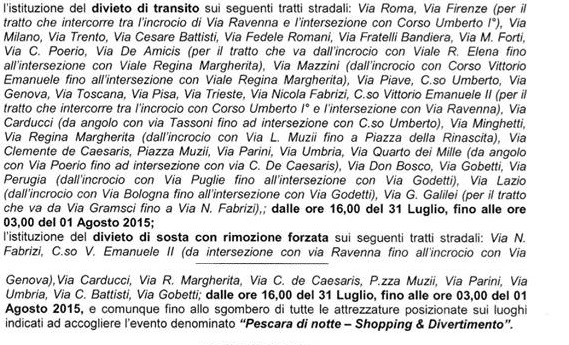 Un ampio quadrilatero con divieto di transito e sosta, compreso fra Corso Vittorio, via Carducci, Piazza Muzii a nord e via Lazio a sud della città, una navetta farà da spola fra il terminal dei bus e il Porto Turistico dove si svolge la Notte bianca dello shopping.
