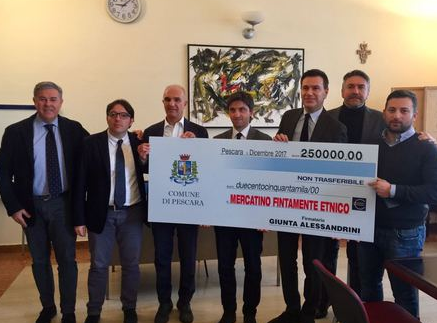 Mercato etnico, in Consiglio plateale protesta del centrodestra. Un maxi assegno da 250 mila euro, con il logo del Comune di Pescara, intestato al ‘Mercatino fintamente etnico’ e firmato dalla ‘Giunta Alessandrini’.